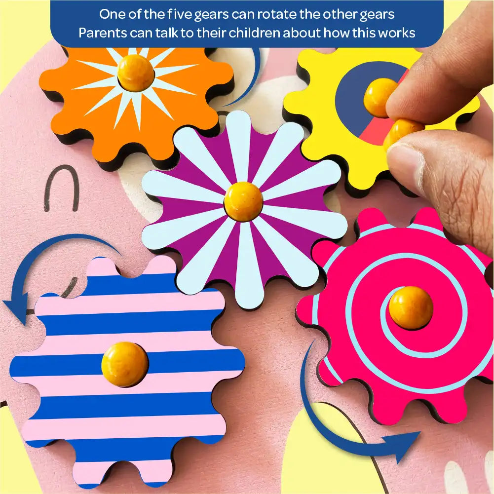 - How to play: Turn the Gear slowly with wooden knob and watch how each interlocking segment move each other. Five Interchangeable wooden gears fit perfectly in the wooden knob with smooth 360-degree rotation. Get your gears moving!