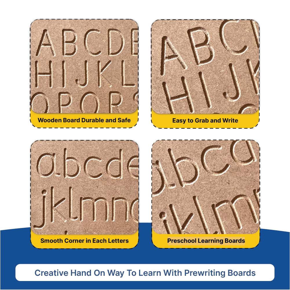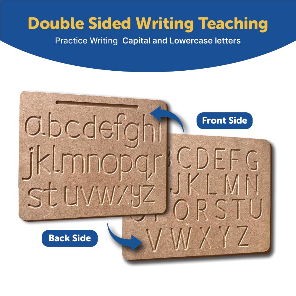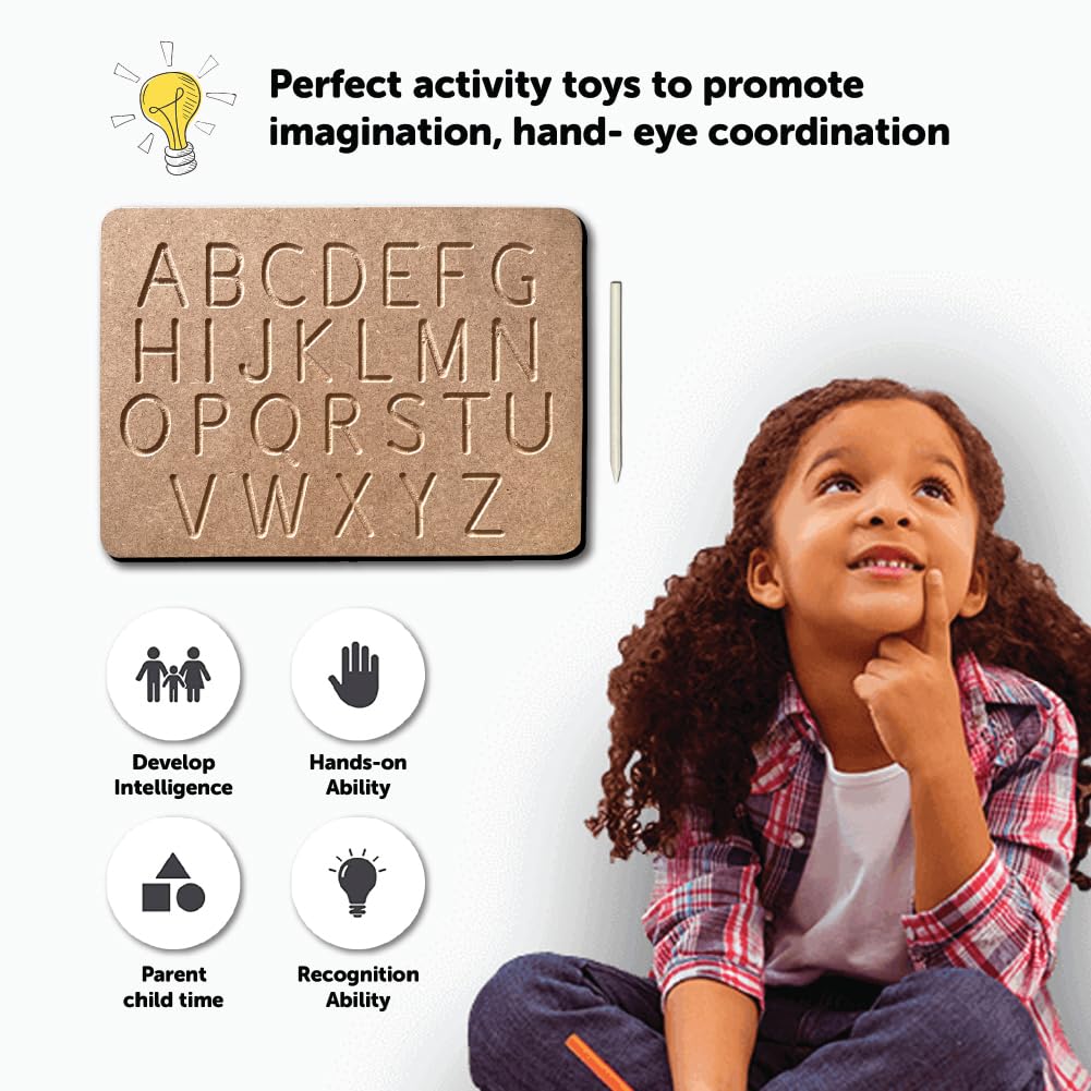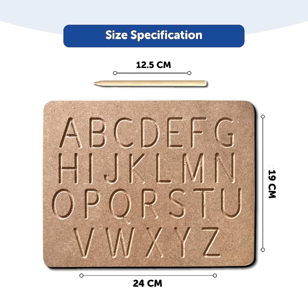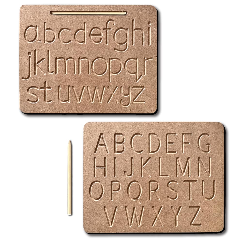 - This is a wonderful engraved board to help your child for brain development to form correctly. The set contains engraved on natural MDF board and a wooden dummy pencil child can use the wooden pencil to tracing the letters on the board.